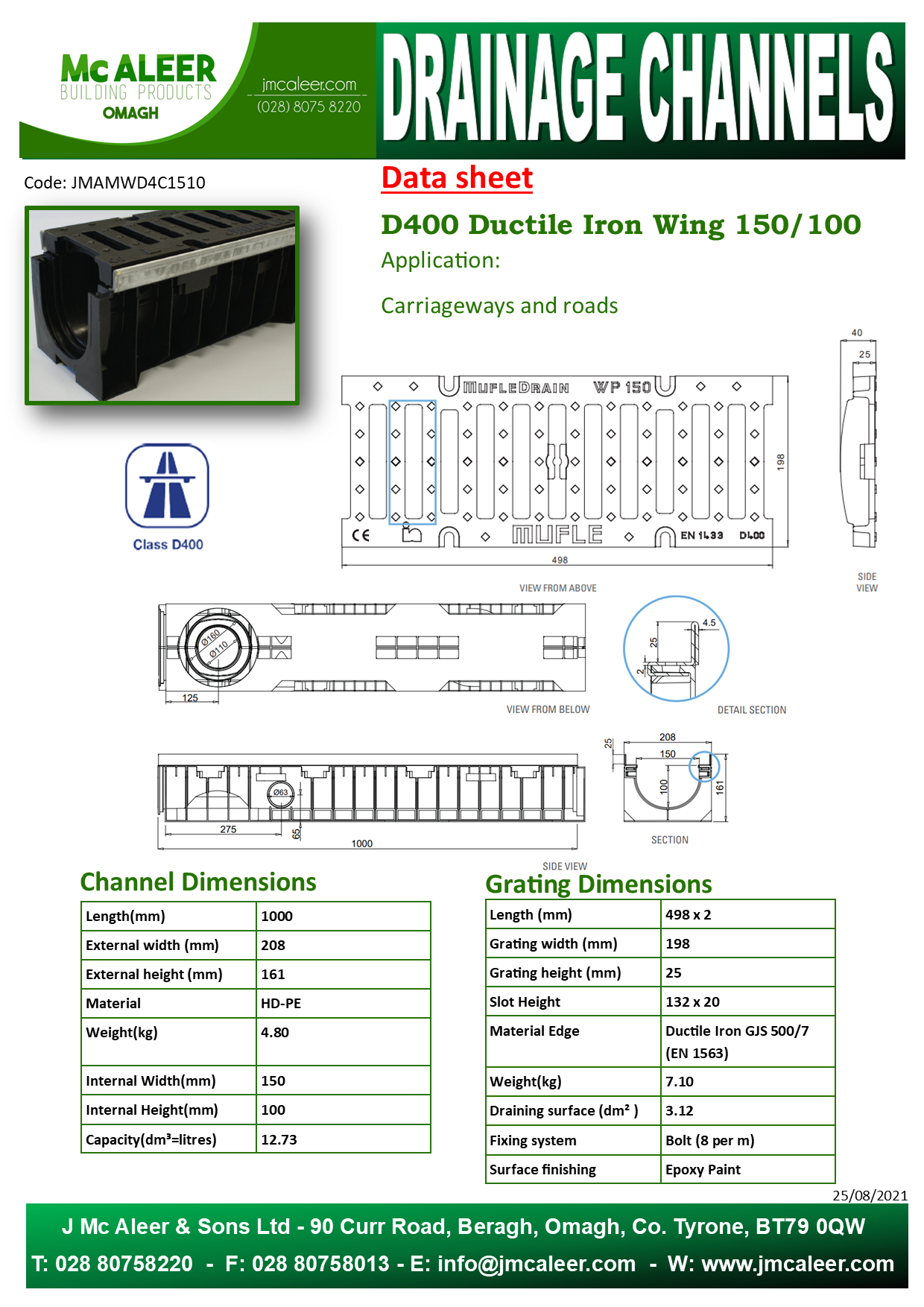 Complete Per M 150W x 100D 1m PVC Base Glv Steel Edge 2 D400 DI Grates & Locking Bolt Kit