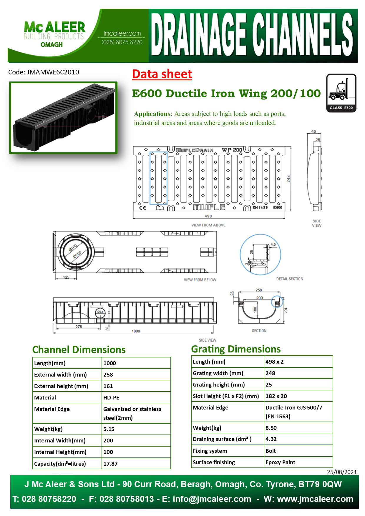 Complete Per M 200W x 100D 1m PVC Base Glv Steel Edge 2 E600 DI Grates & Locking Bolt Kit
