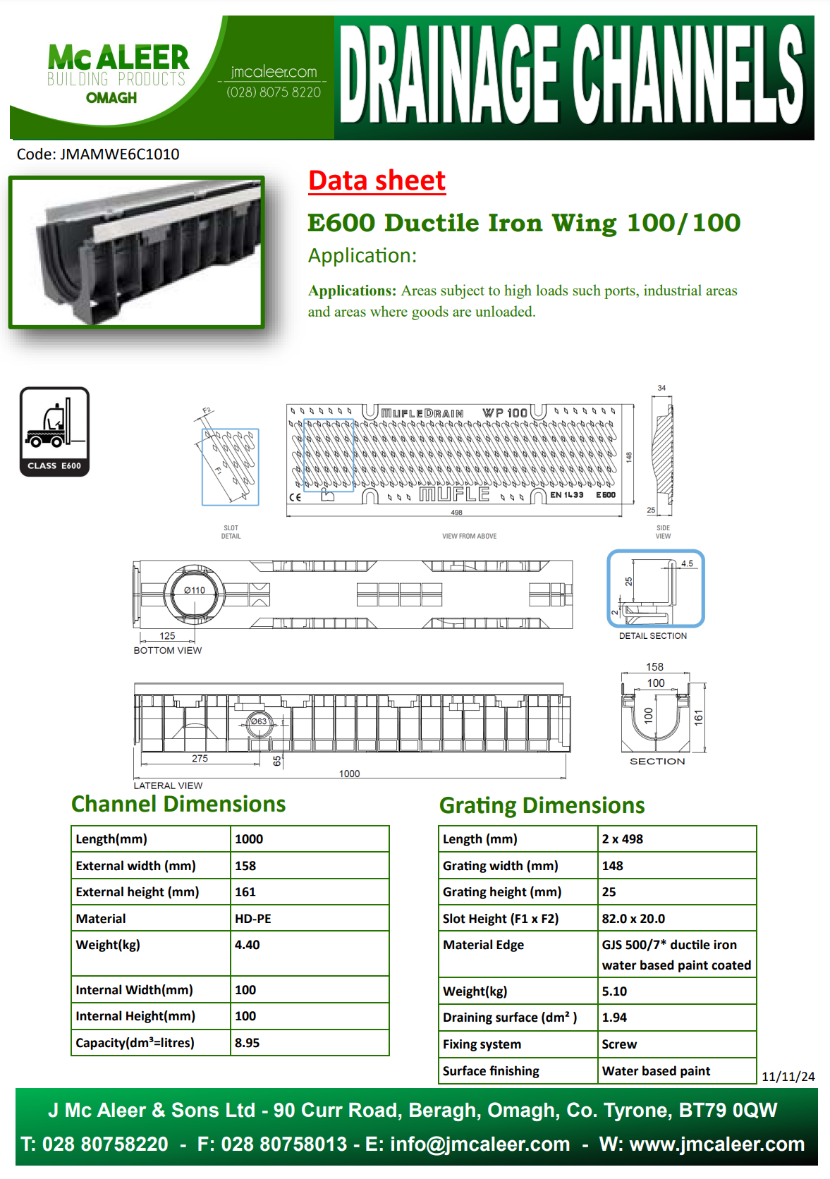 Complete Per M 100W x 100D 1m PVC Base Glv Steel Edge 2 E600 DI Grates & Locking Bolt Kit 6MM SLOT GRATE